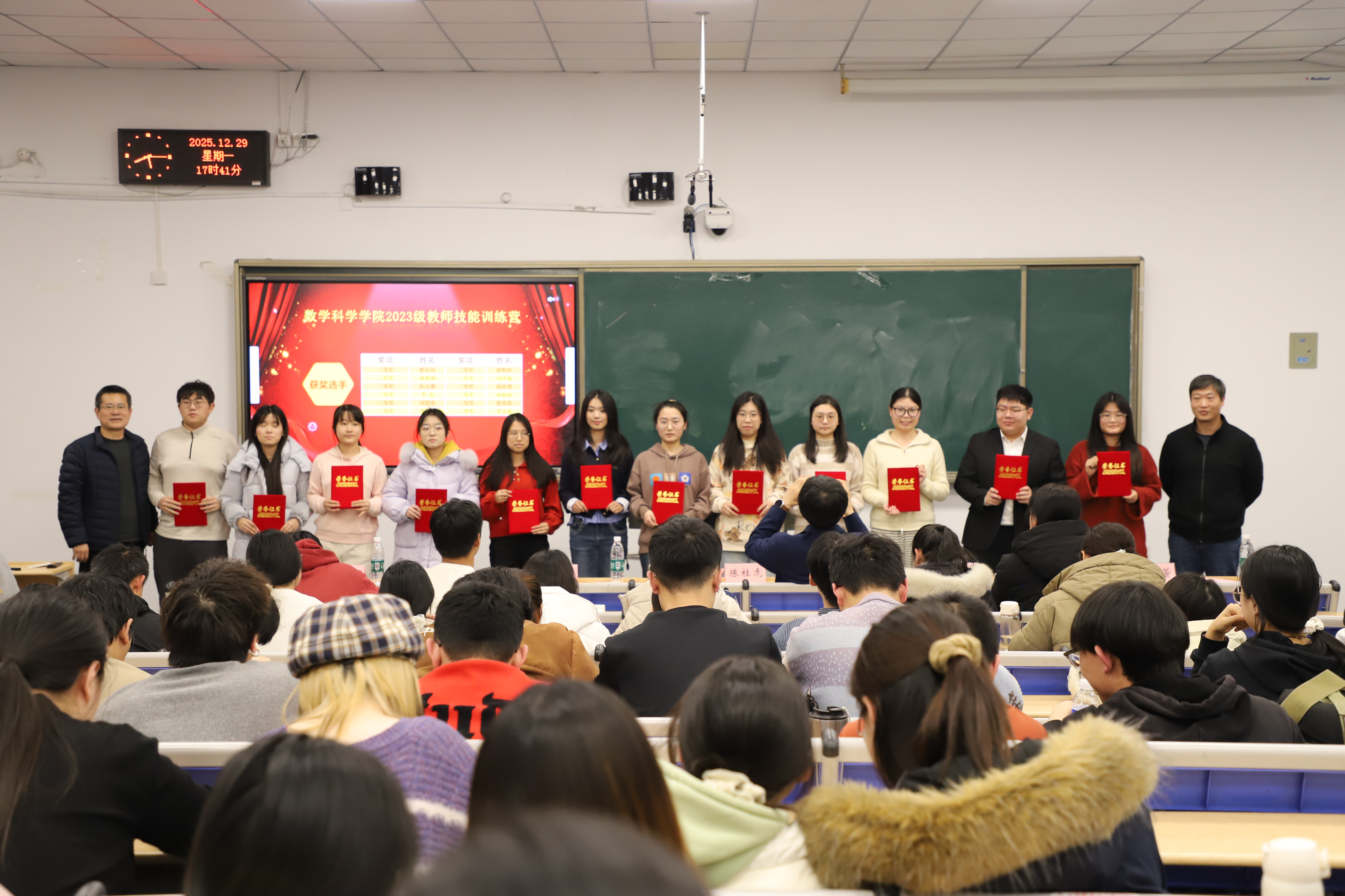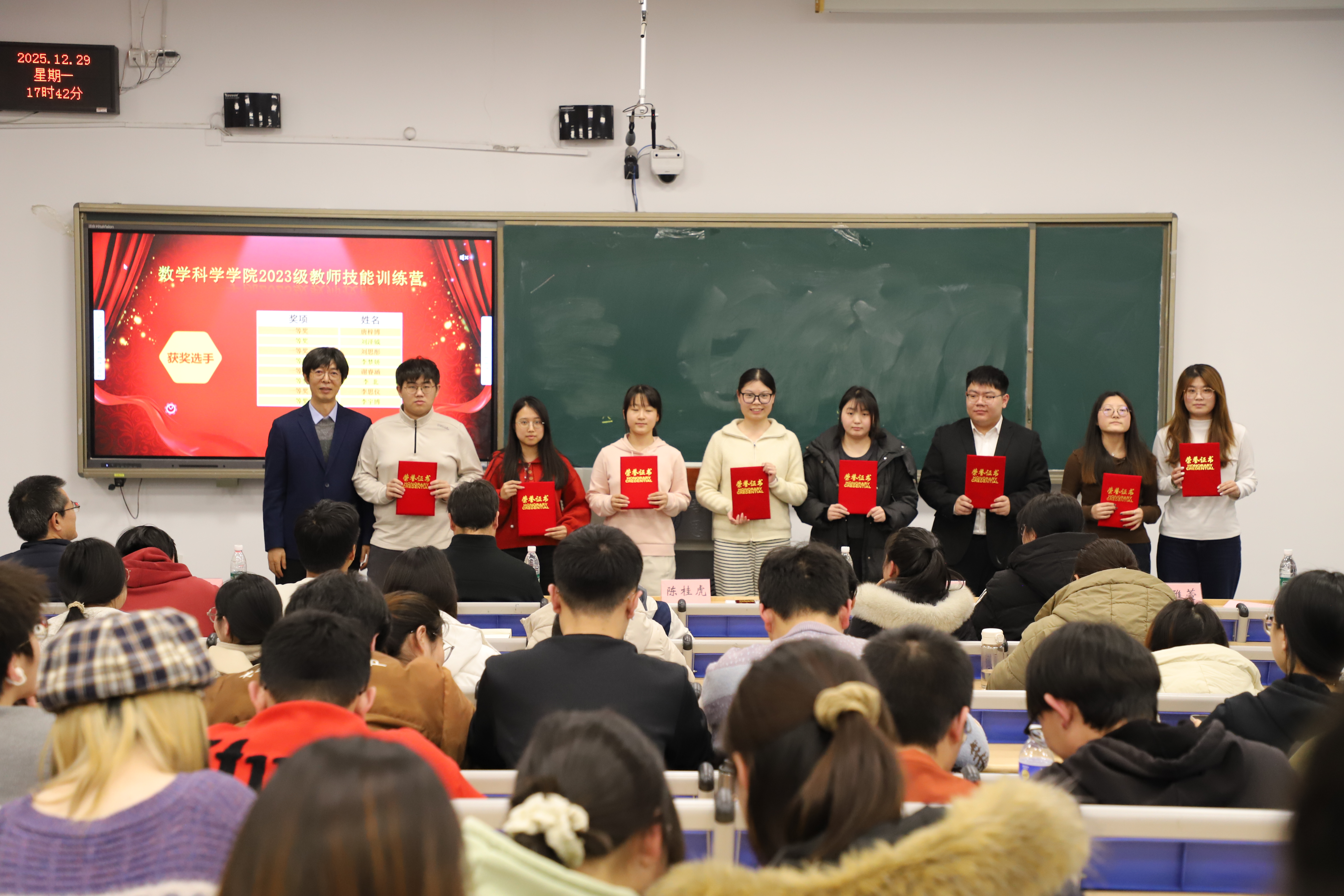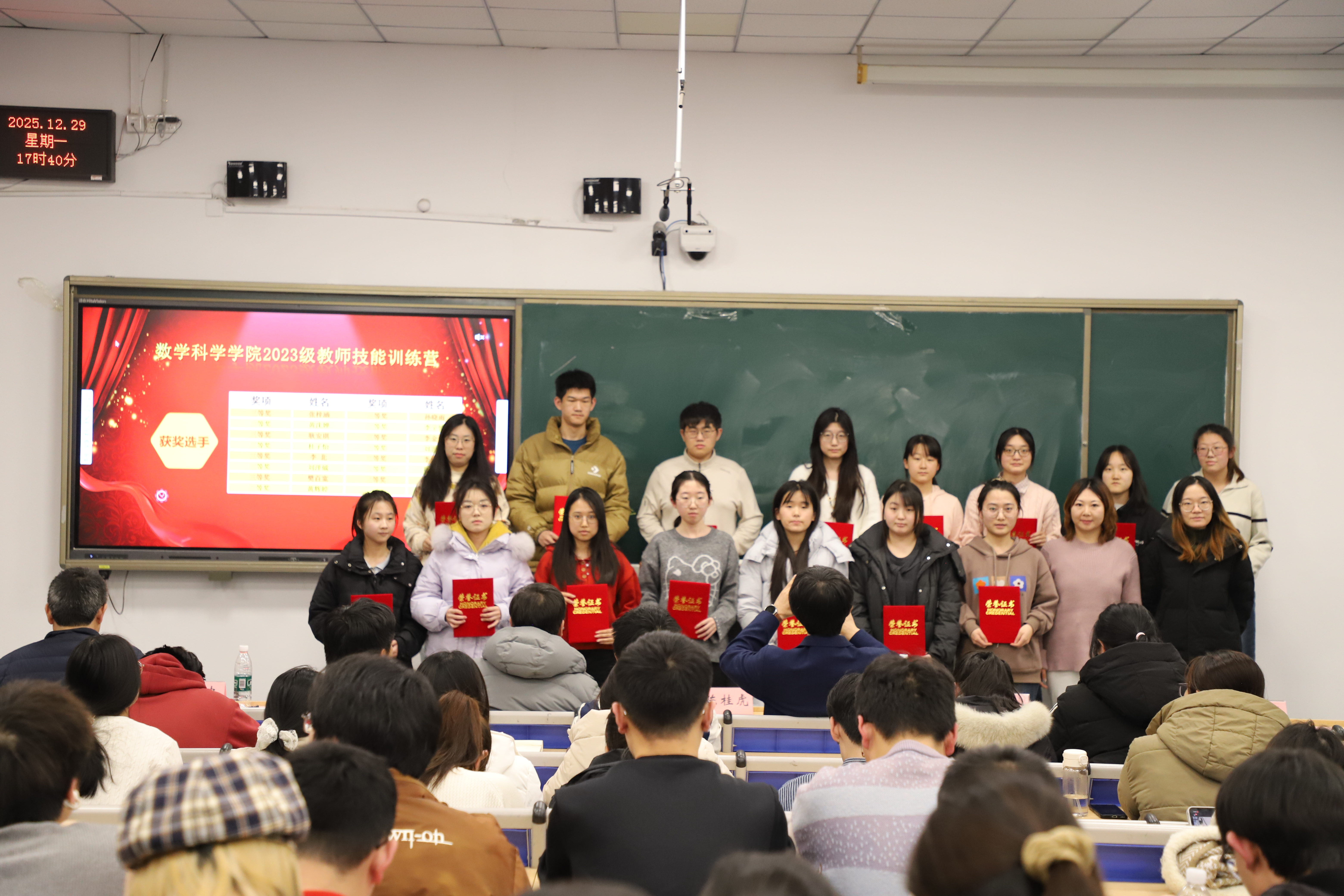 随后,陈桂虎老师为同学们现场讲授了一节高中数学课,巧妙的课堂导入、轻松的课堂互动、精彩的内容讲授,为即将参加实习工作的同学们呈现了一堂生动鲜活的教学示范课。活动现场,与会老师还为参加学院教师技能大赛获奖同学颁发了荣誉证书。
