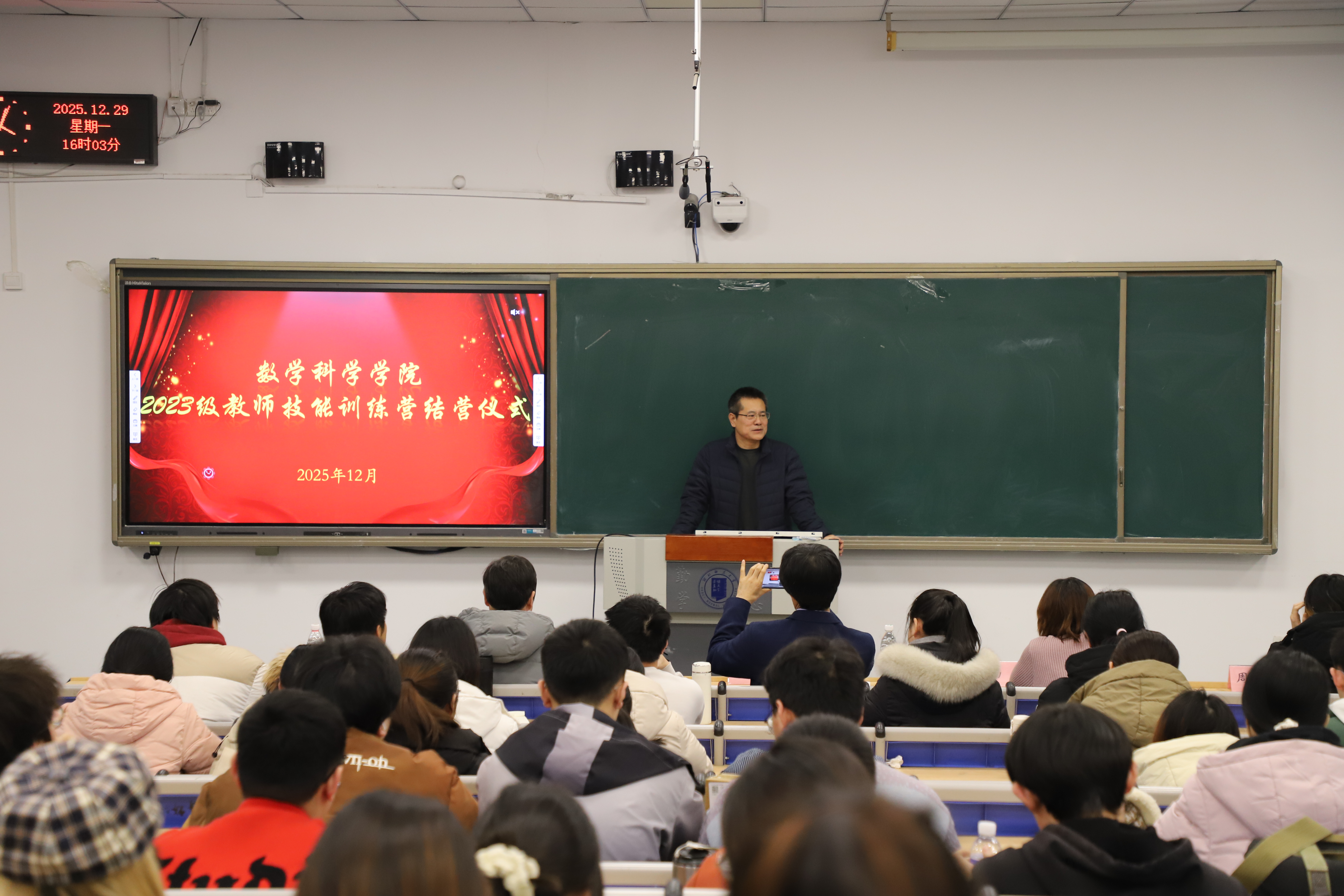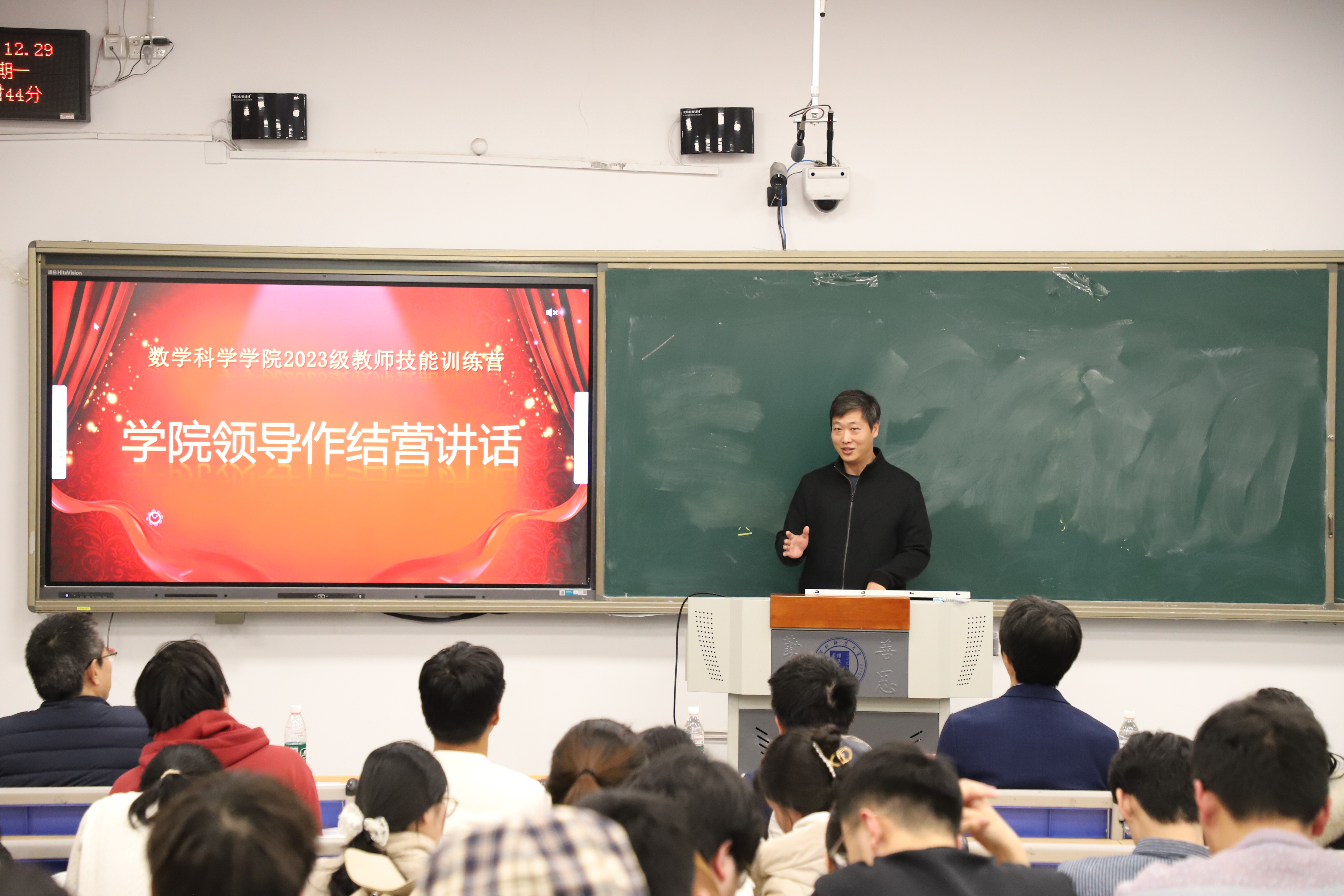 鲁明做训练营结营总结,他表示,经过一学期的系统训练,同学们在教姿教态、板书设计、课堂互动等方面实现了显著提升,感谢指导老师们的辛勤付出和同学们的不懈努力,他勉励同学们以陈桂虎老师为榜样,认真钻研,刻苦训练,充分备课,信心满满奔赴下学期的实习工作,圆满完成实习任务。