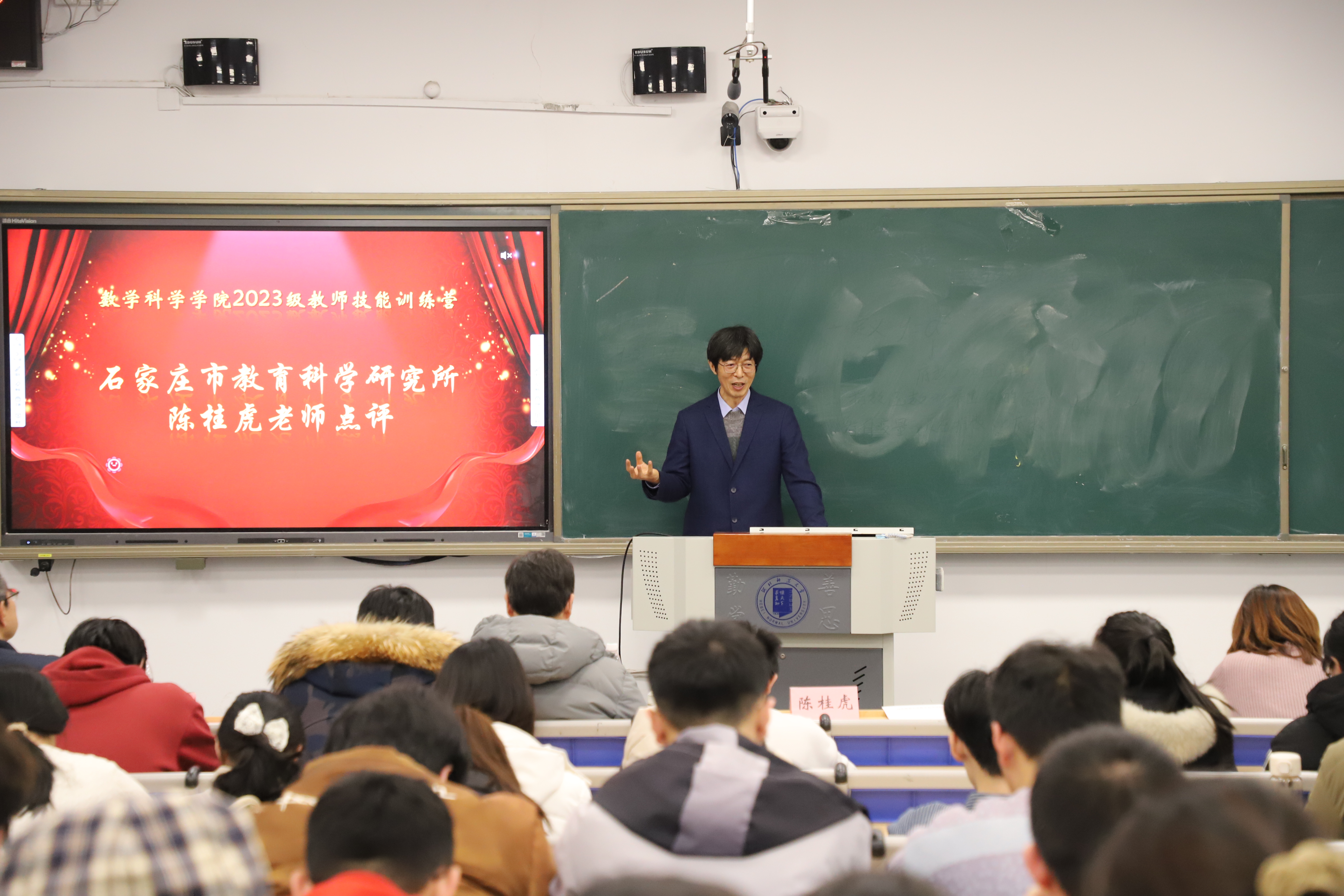 2023级师范生刘思彤、唐梓博、谢睿涵分别进行了说课、教学设计、课前导入现场展示,陈桂虎老师对同学们的授课逐一点评,精准剖析了教学亮点与不足,并结合数学教学的6个核心素养,从课程目标、授课重点、难点、精彩点等方面给大家指出了改进方向。